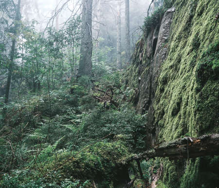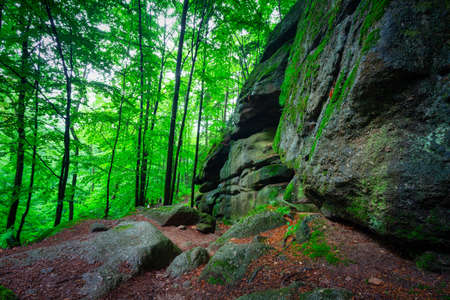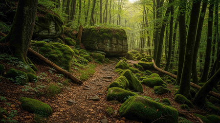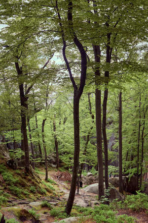 Hiking trail in the green forest with rocks and moss, Czech Republic