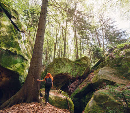 Red-haired young woman with backpack enjoying her trail in the green spring forest. Active life concept.