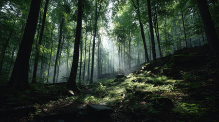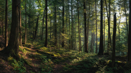 A captivating scene of a dense forest with sunlight gently filtering through tall trees, creating a serene and tranquil atmosphere. Perfect for nature enthusiasts.