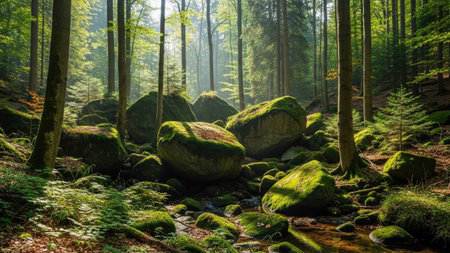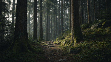 Serene digital rendering evoking tranquil woodland immersion via masterful light scattering and textured layering techniques. Suited for eco-tourism promotions, wellness retreats visuals, adventure travel graphics, and sustainable living campaigns targeting nature enthusiasts and designers. Exceptional depth and luminosity balance enhances adaptability for posters, b... AI-generated illustration.