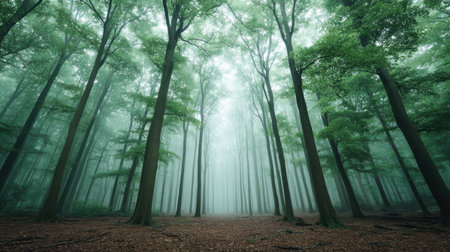Discover a captivating forest scene, showcasing towering trees enveloped in mist. The fog creates an ethereal atmosphere, highlighting nature's calm and beauty.