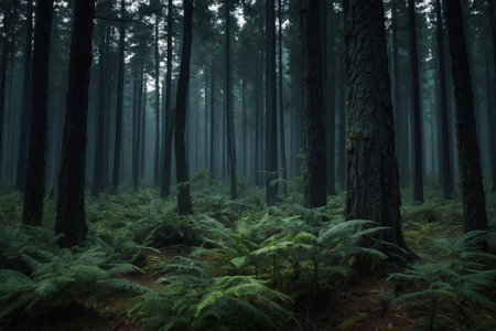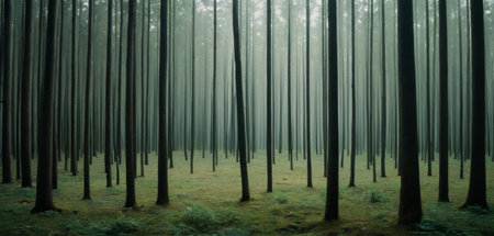 a moody and atmospheric forest scene, captured by wiesaw wakuski in the style of national geographic photography. the image showcases a dense forest with tall trees and lush grass, featuring a color palette of light green and dark brown. the post-processing enhances the details, creating a highly detailed and captivating environment, reminiscent of the works of lev lagorio. ai generated