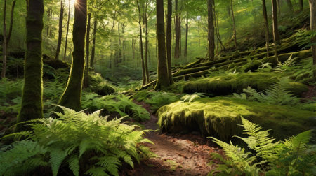 A winding dirt path leads through a sun-dappled forest. Lush green ferns and mossy rocks line the sides of the trail, with sunlight filtering...