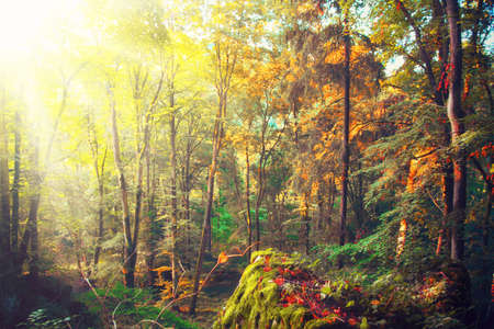 Beautiful Forest in golden autumn with beautiful bright sun rays - wanderlust
