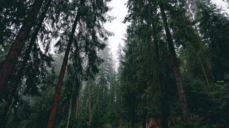 This captivating image showcases a misty forest where tall evergreen trees rise through a gentle fog, creating a serene and tranquil atmosphere perfect for nature lovers.