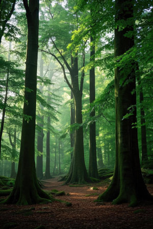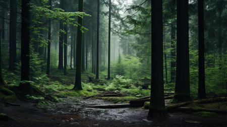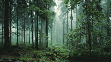 This captivating scene portrays a dense forest with tall trees enveloped in lush greenery and a mystical mist, creating a serene and tranquil atmosphere perfect for nature enthusiasts.