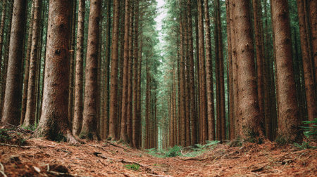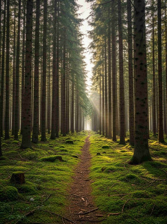 Discover a serene pathway winding through a majestic pine forest, characterized by tall trees and a natural green undergrowth. The tranquil scene invites exploration and reflects the beauty of untouched nature.
