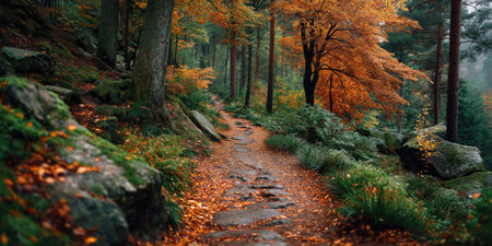 A serene forest path is covered with vibrant autumn leaves. Sunlight filters through tall trees creating a peaceful and inviting atmosphere. Its an ideal location for nature walks and relaxation.