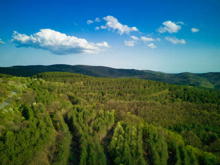 Bird's eye view of spring blooming green meadows and wooded hilly slopes of the Balkan Mountains, under the light of a bright cloudy warm day in the country of Bulgaria