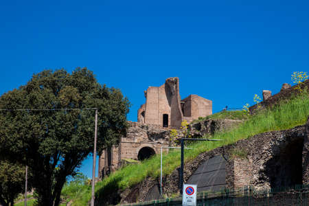 The ancient ruins of the Roman Forum and Palatine hill. Old road. Rome, Italy.
