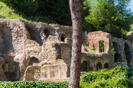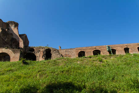 Panoramic view of the Ancient Rome Imperial Palace ruins on Palatine Hill from Romulus and Remus panoramica terrace, in the historic center of Rome