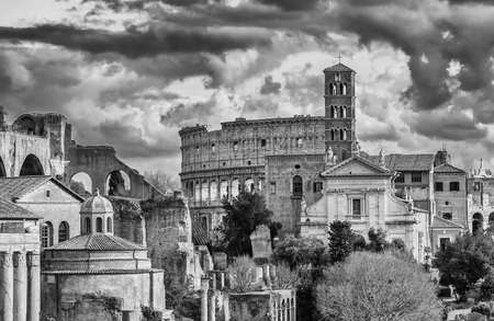 Saint Frances of Rome Church and Coliseum ruins seen from Capitoline Hill with beautiful clouds (Black and White)