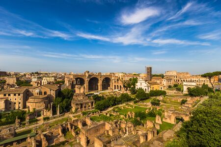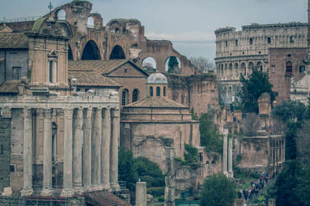 View of the Roman Forum, Palatine Hill. The Colosseum area. Rome, Italy.