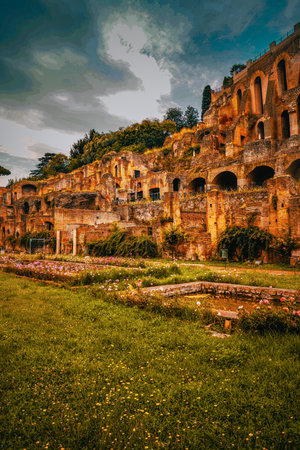 Roman ruins and flower gardens. Shooting Location: Rome, Italy