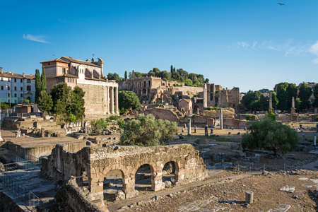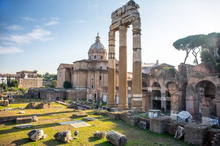 Rome, Italy: The Roman Forum, Latin: Forum Romanum, Italian: Foro Romano, in the spectacular sunrise. Beautiful representative picture of antique ruins. The historical center of the Forever City.