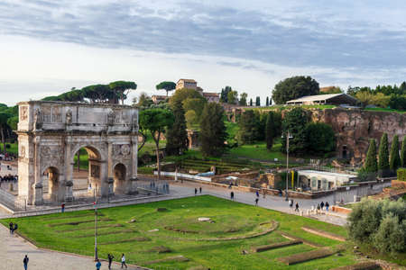 ROME, ITALY - JUNE 28, 2019: Arch of Titus and green trees under grey sky