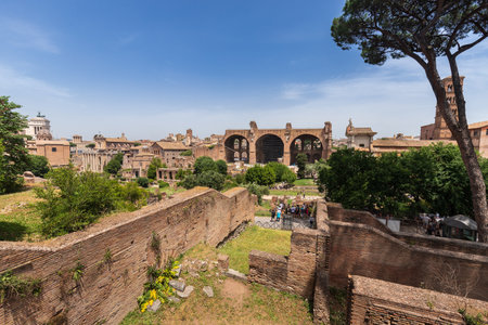 ROME, ITALY - JUNE 24, 2017: Panorama of Ruins of Roman Forum and Capitoline Hill in city of Rome, Italy