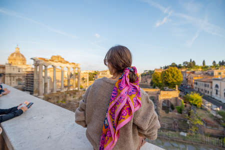 Woman enjoying view on the Roman Forum, ruins at the center of Rome on a sunset. Concept of traveling famous landmarks in Italy. Caucasian woman wearing colorful shawl in hair and sunglasses