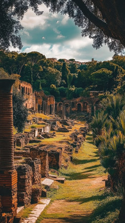 Wander through the historical ruins of an ancient Roman forum, surrounded by abundant greenery and distant hills, while the clouds drift above in Italy's beautiful landscape.