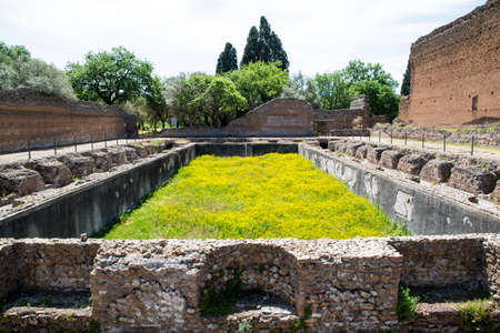The peristyle garden court of the House of the Vestal Virgins (Atrium Vestae) with a double pool at Roman Forum during sunset in Rome, Italy