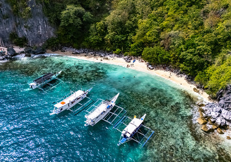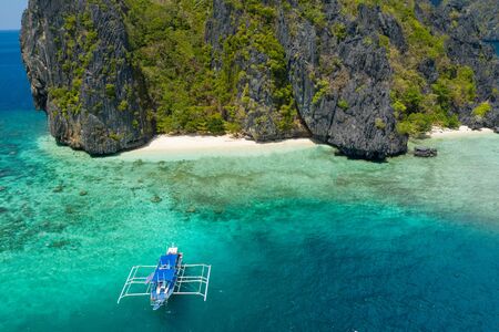 Aerial view of tropical island in Philippines. Boats in blue lagoons and lakes, white sand beach, rocks cliffs mountains and coral reef