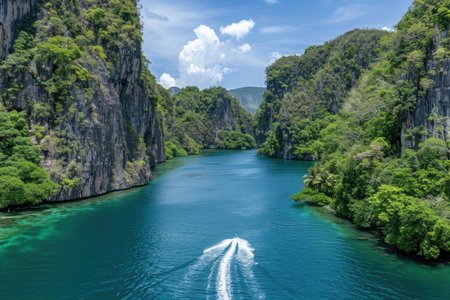 A lone boat carves through the tranquil waters of a narrow, verdant fjord, surrounded by towering limestone cliffs and lush tropical foliage.