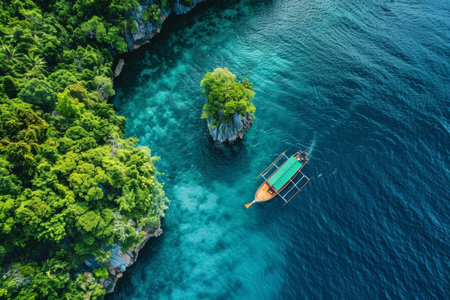 A stunning aerial view showcases a lone boat navigating through crystal-clear turquoise waters, embraced by lush green cliffs and rocky formations, embodying tranquility.