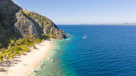Beautiful beach with boats and tourists. Tropical bay in El Nido. Aerial view: bay and the tropical island. Tropical lagoon with turquoise water and white sand. Seascape: mountains, ocean. Sky and mountains rocks. Philippines, El Nido. Travel concept.