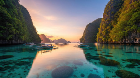 A stunning lagoon is framed by towering cliffs covered in green foliage, creating a picturesque vista. The calm turquoise water reflects the sky, which displays a gradient of orange and blue hues at sunset. Boats are visible, suggesting leisure activities. Ideal for travel, nature, or environmental themes.