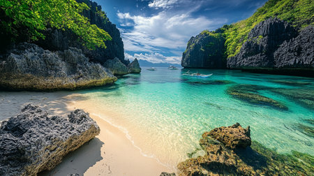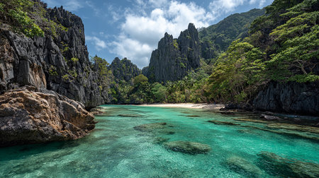 A vibrant image presents a serene tropical lagoon. The scene showcases clear turquoise waters reflecting sunlight. Towering cliffs, covered in lush green vegetation, frame the water. The composition highlights a sense of natural beauty. Suitable for travel publications and environmental projects, it offers versatile applications.