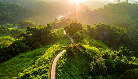 Stunning view of green coffee plantations on hills, with morning mist and warm sunlight creating a serene atmosphere.