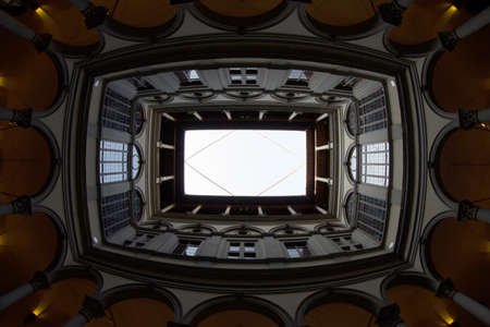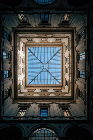 An architectural image presents an upward perspective of a building's interior courtyard, showcasing a grid-like glass skylight. The structure features symmetrical lines, columns, and windows, suggesting a historical or classical design. The composition emphasizes geometric patterns and the play of light and shadow, suitable for architectural, design, or artistic projects.