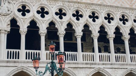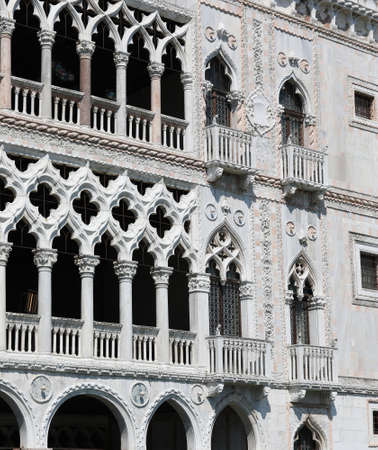 Venice, VE, Italy - July 10, 2019: Detail of Facade of Palace called Ca D Oro that means Golden House in Italian language