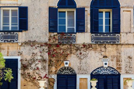 Facade of a house with blue wooden windows and a door in the city of Mdina in Malta.Sights of the island of Malta