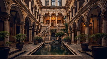 The ornate architecture of the old building exudes elegance and history generated by artificial intelligence