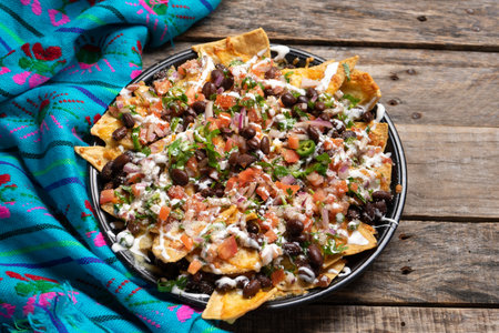 Traditional mexican nachos with beans and pico de gallo sauce on wooden background