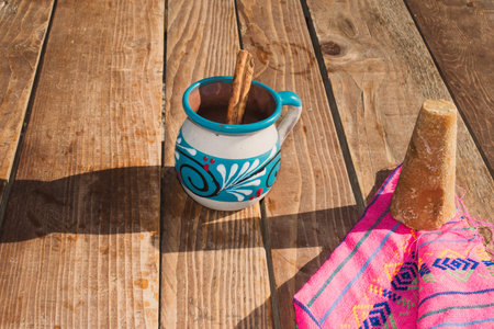 Mexican coffe ( café de la olla ) with cinnamon and brown sugar on a Mexican serape