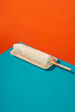 cooked corn prepared with salsa, mayonnaise, cheese and potatoes, Mexican snack