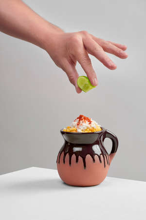 a Latino, Hispanic man squeezes a green lime over an Esquite, corn in a cup, a typical Mexican dish, in a clay cup with yellow corn, Mexican Huasteca cheese and chili powder on a white background, one hand