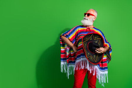 Cheerful elderly man in colorful traditional Mexican attire posing confidently against a vibrant green background