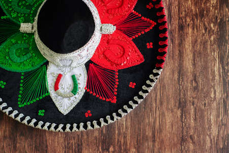 Mexican charro hat on wooden table. Typical mexican hat with the colors of the mexican flag.