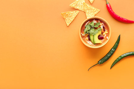 Creative geometric food pattern from mexican nachos corn chips, fresh vegetables, fruits, greens, chili, garlic - ingredients for tomato chili sauce on a red background. Flat lay