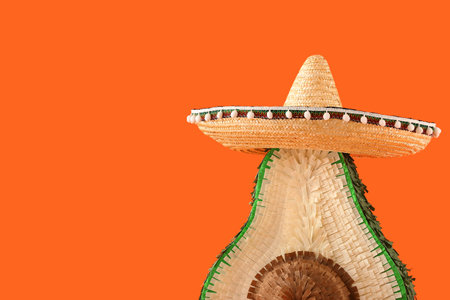 Mexican pinata in shape of avocado and sombrero hat on color background