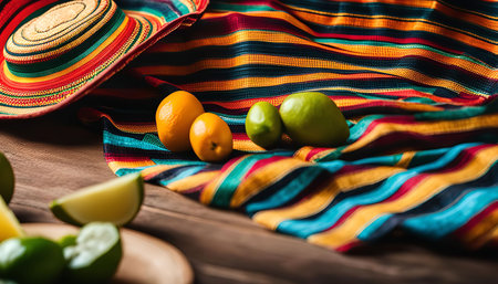 A vibrant still life featuring a colorful sombrero, limes, and a striped fabric, capturing the essence of a Mexican fiesta.
