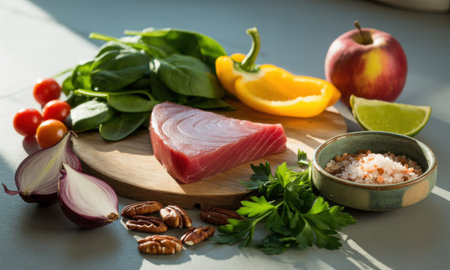 Raw tuna steak, fresh spinach, cherry tomatoes, red onion, yellow bell pepper, apple, lime, parsley, pecans, and himalayan salt arranged for a healthy meal preparation.