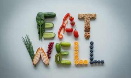 Fresh vegetables, fruits, nuts, and grilled salmon are artfully arranged to spell eat well, promoting healthy eating, balanced diet, and wellness.