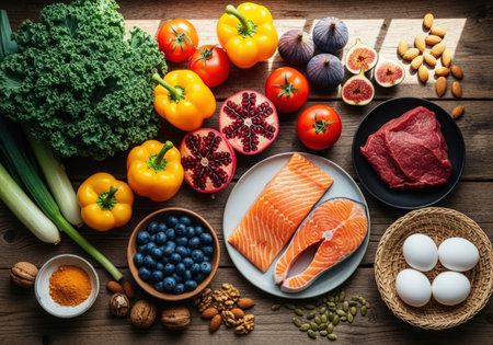 A vibrant assortment of healthy foods: salmon, beef, eggs, berries, tomatoes, greens, nuts, and figs arranged on wooden surface.