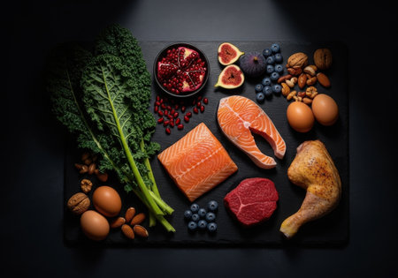 A variety of nutritious foods like salmon, blueberries, kale, figs, eggs, nuts, and chicken arranged on a dark surface.