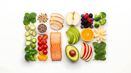 Assorted fresh vegetables, cuts of meat, and grains are neatly organized, emphasizing nutritious choices for a wholesome meal.