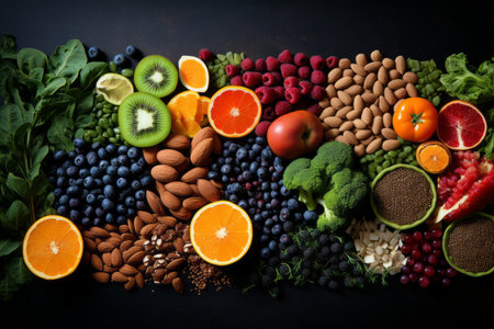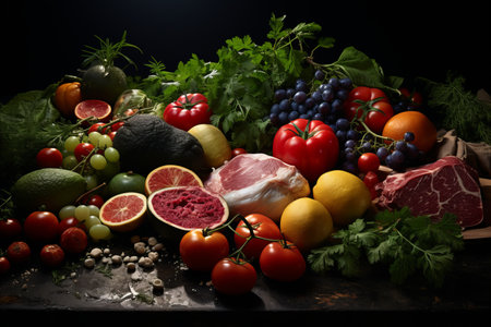 Vibrant and nutritious assortment of fresh fruits and vegetables on dark solid background
